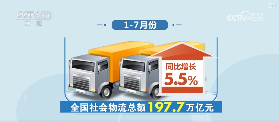 1—7月份,全国社会物流总额197.7万亿元,同比增长5.5%。7月当月,社会物流总额同比增长5.3%,比上月加快0.1个百分点,扭转了4月以来的回落态势。