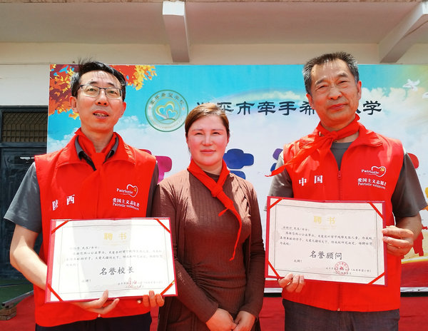 活动中,为感谢爱心企业家和人士的付出,翟丽娜校长为陕西省爱国主义志愿者协会颁发了“最具爱心慈善协会”荣誉证书,分别为许衙评、郑伟亭颁发了名誉顾问、名誉校长聘书,为魏建勋、闫建华、张虎、李霞和周亿慧、张贵阳颁发了爱心大使荣誉证书和名誉校长聘书。