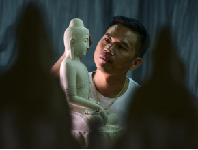 “持经罗汉”,又唤苏频陀尊者,也被称为托塔罗汉,手持经书象征对于佛法的深刻理解与修行,时而也会托塔为了纪念师父佛祖释迦摩尼。巍然而立的身形,左手托举经书于胸前,右手自然垂摆手指微张,代表着包容。眉心紧锁眼睛微眯,严肃的嘴角和胸膛肌肉线条刚毅略显力量,严肃而不乏为世间担烦忧。披肩与裙摆柔情似水线条柔畅井然有序,脚上细节宽厚沉稳,古有观音柔和之美,今天在徐大师的雕塑工艺下这尊“持经罗汉”作品刻画出了刚柔并济的罗汉力量和慈善之美,值得点赞!