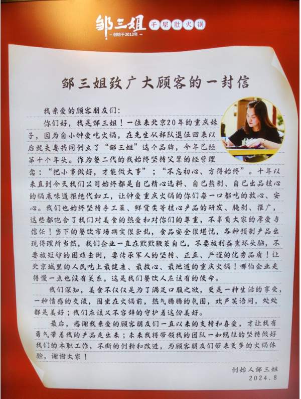 成立十余年来,邹三姐品牌坚持所有门店锅底均无配送方、承包方和代加工。从精选食材、采购入库到配方熬制、运输到店、均有老板亲自带队完成。以最高的标准把控每一个细节,只为让每一个食客吃得安心、放心。邹三姐始终坚守“现炒好锅底,味道更重庆”的理念,拒绝所有添加剂及科技狠活,并立志终身坚持打造一次性健康绿色好火锅。