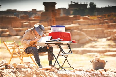 中方考古队员文臻在中埃卢克索孟图神庙联合考古项目所在地工作。