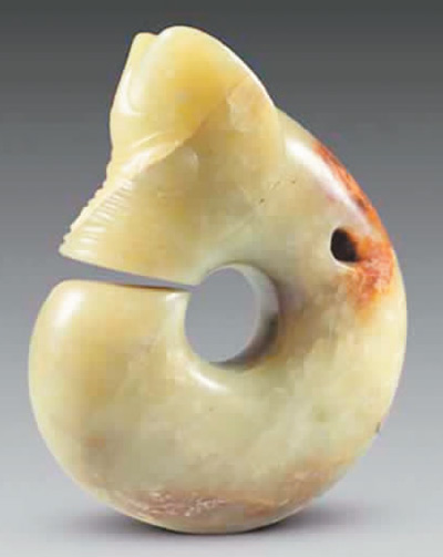 玉猪龙是红山文化玉器中独具特色的一种器型。牛河梁出土的一件玉猪龙为淡绿色玉质,其身蜷曲如环,龙首雕刻精美,长立耳,耳廓宽大高耸,双目圆睁微鼓,吻部前凸,口略张开露齿,栩栩如生。