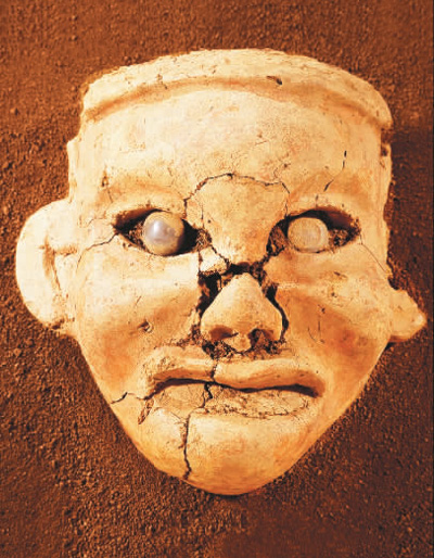 在综合馆内,一件女神头像吸引了众多参观者驻足。女神头像出土于女神庙主室西侧北壁下,头顶以上部分残缺,现高22.4厘米,面宽16.5厘米,与真人大小相仿,额顶有箍饰,鬓角部位有竖行的系带,出土时头像呈鲜红色,嵌淡灰色玉石作为眼睛。这件塑像由黄泥掺草禾等塑成,未经烧制,外皮经过打磨,较为光滑。其造型高度写实,面部特征为高颧骨,浅眼窝,低鼻梁,薄嘴唇。