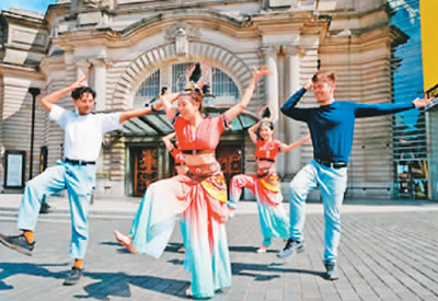 在英国爱丁堡街头,路人跟随中国舞蹈演员跳起敦煌舞。