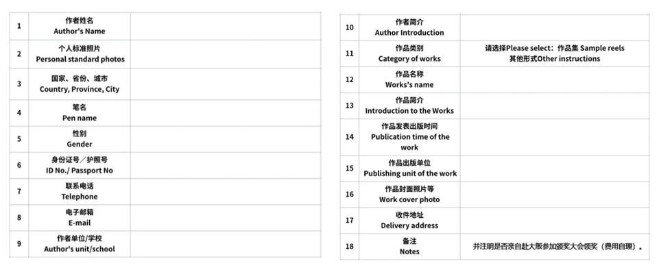 投稿可采用中文或英文,须附2000字以内文字,内容包括三个部分组成,作者简介、作品简介(主要是出版或发表情况说明),符合组委会公众号发布内容,也是出版作品集内容,作品节选1800字以内(全部或主要部分,扫描或拍照图书10页以上,或全部电子稿,方便评审阅读作品内容,不收实物图书)、个人标准照片、作品封面照片,须注明著作出版时间、出版单位、个人联系电话、电子邮箱等信息。