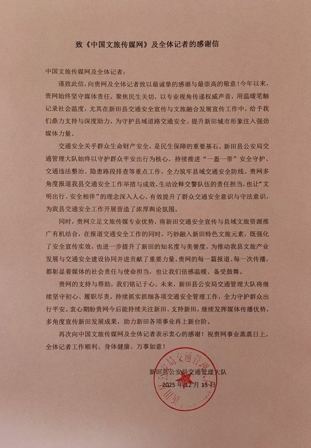 中国融媒网据中国文旅传媒网讯(记者 华朦朦)近日,新田县公安局交通管理大队正式致信《中国文旅传媒网》及全体记者,以真挚的笔触表达了对该网在县域交通安全宣传与文旅融合发展推广工作中鼎力支持的衷心感谢与崇高敬意,高度肯定了媒体力量在守护道路安全、提升城市形象中的重要作用。