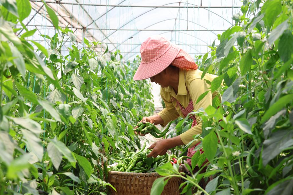 不久前,记者来到该县逢亭镇床井村,走进一片大棚里,翠绿的螺丝椒挂满枝头,十多位村民穿梭其间忙着采摘。