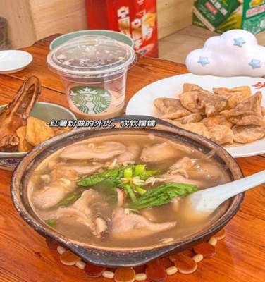 三角叉:软软糯糯,外皮是红薯粉做的,里面就是正常的肉馅,里面还有粉丝,虾米,香菇,青菜等配菜.像换了外皮的江西小馄饨。