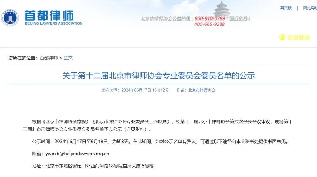 6月17日,根据《北京市律师协会章程》《北京市律师协会专业委员会工作规则》,经第十二届北京市律师协会第六次会长会议审议,北京市律师协会对第十二届北京市律师协会专业委员会