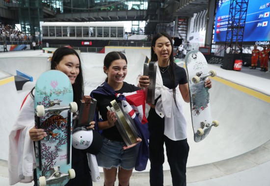 5月19日,冠军澳大利亚选手阿丽莎·特鲁(中)、亚军日本选手开心那(右)与季军日本选手四十住樱在颁奖仪式后合影。当日,在巴黎奥运会资格系列赛上海站滑板女子碗池决赛中,澳大利亚选手阿丽莎·特鲁夺得冠军,日本选手开心那与四十住樱分获二、三名。新华社记者 贾浩成 摄