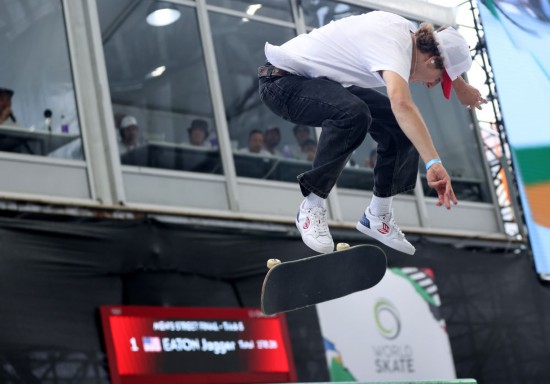 5月19日,美国选手贾格尔·伊顿在比赛中。当日,在上海举行的巴黎奥运会资格系列赛滑板男子街式决赛中,美国选手贾格尔·伊顿夺得冠军,日本选手小野寺吟云与美国选手克里斯·乔斯林分获亚军和季军。新华社记者 贾浩成 摄