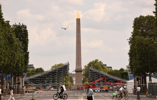 这是6月4日在位于法国巴黎市中心的协和广场拍摄的临时比赛场地搭建现场。新华社记者 高静 摄