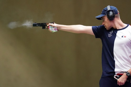 2021年8月2日,法国选手基康普瓦在比赛中。当日,在东京奥运会射击男子25米手枪速射决赛中,法国选手基康普瓦获得金牌。新华社记者 鞠焕宗 摄