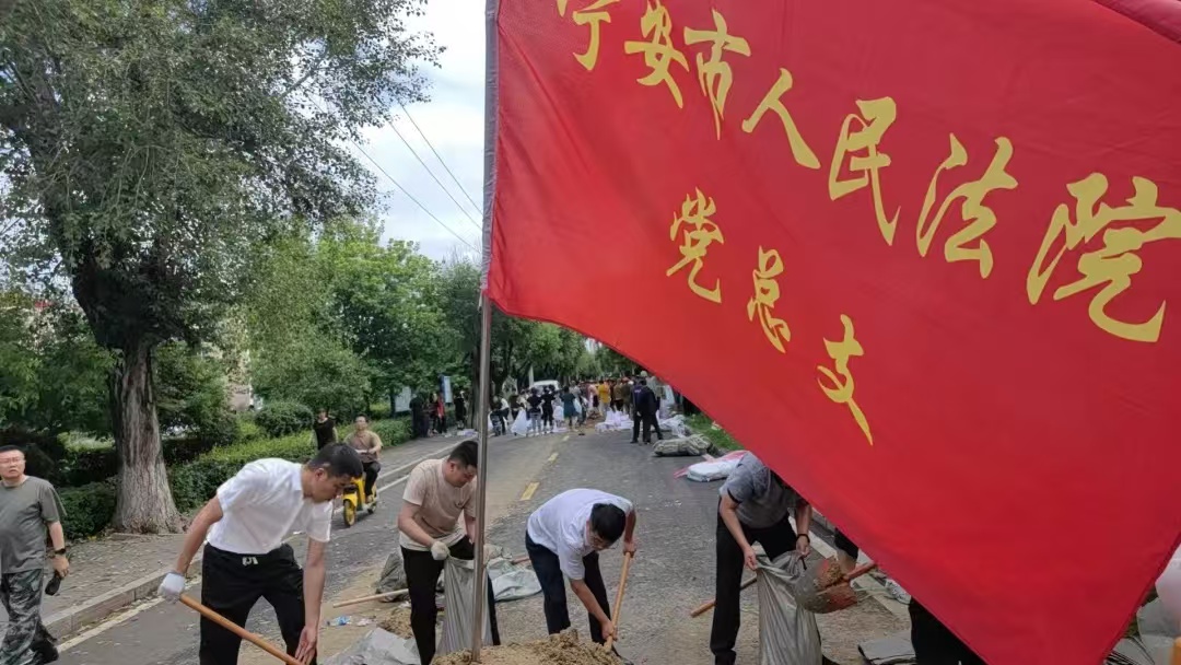 审判机关以实际行动诠释政法铁军先锋本色。充分发挥基层党组织战斗堡垒作用和党员先锋模范作用,争分夺秒,依令而动,积极参与支援抗洪抢险工作,将沉甸甸的沙袋扛起、卸下并一排排码放在堤坝处,把抗洪防灾这场硬仗当作对法院干警初心使命的考验,让鲜红的党旗在抗洪抢险一线高高飘扬。