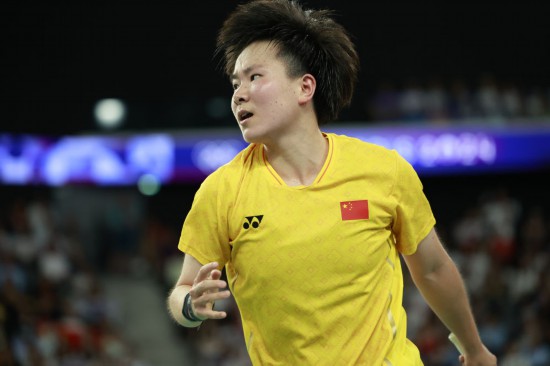 8月5日,中国选手何冰娇在比赛中。当日,在巴黎奥运会羽毛球项目女单决赛中,韩国选手安洗莹获得金牌,中国选手何冰娇获得银牌。新华社记者 任正来 摄