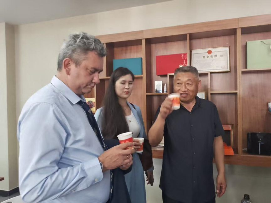 阿扎马特先生来到连翘实验室和产品展开区。他饶有兴趣的品尝了连翘速溶茶,当场对该茶的颜色、口感和速溶程度给予了很高的评价。速溶茶是公司的系列产品之一,目前公司研发提取的“连翘素”成为中医药(感冒常用药)主要原材料之一,并将向国内知名药厂签约供应,同时正在寻求保健品、化妆品等行业合作。