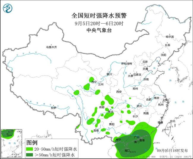 预计9月5日20时至6日20时,西南地区东南部、江南西部和南部、华南南部和中东部等地的部分地区将有8级以上雷暴大风或冰雹天气,其中,广西东南部、广东西南部和南部沿海、海南岛等地的部分地区将有10级以上雷暴大风,最大风力可达11级以上;西北地区中东部、西南地区中东部和南部、江南西部和南部、华南南部和中东部等地的部分地区将有小时雨量大于20毫米的短时强降水天气,其中,广西南部和东南部沿海、广东中西部和西南部沿海、海南岛等地的部分地区小时雨量大于80毫米,最大可达100毫米以上。