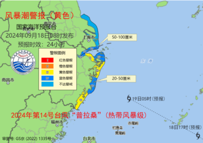 预计未来24小时,浙江省宁波市和温州市风暴潮预警级别为黄色。受台风“普拉桑”影响,预计9月19日凌晨至下午,江苏南通到杭州湾沿海将出现50~100厘米的风暴增水,浙江台州和温州沿海将出现20~50厘米的风暴增水。浙江省宁波市和温州市的风暴潮预警级别为黄色;上海市、浙江省嘉兴市、绍兴市、舟山市和台州市的风暴潮预警级别为蓝色。