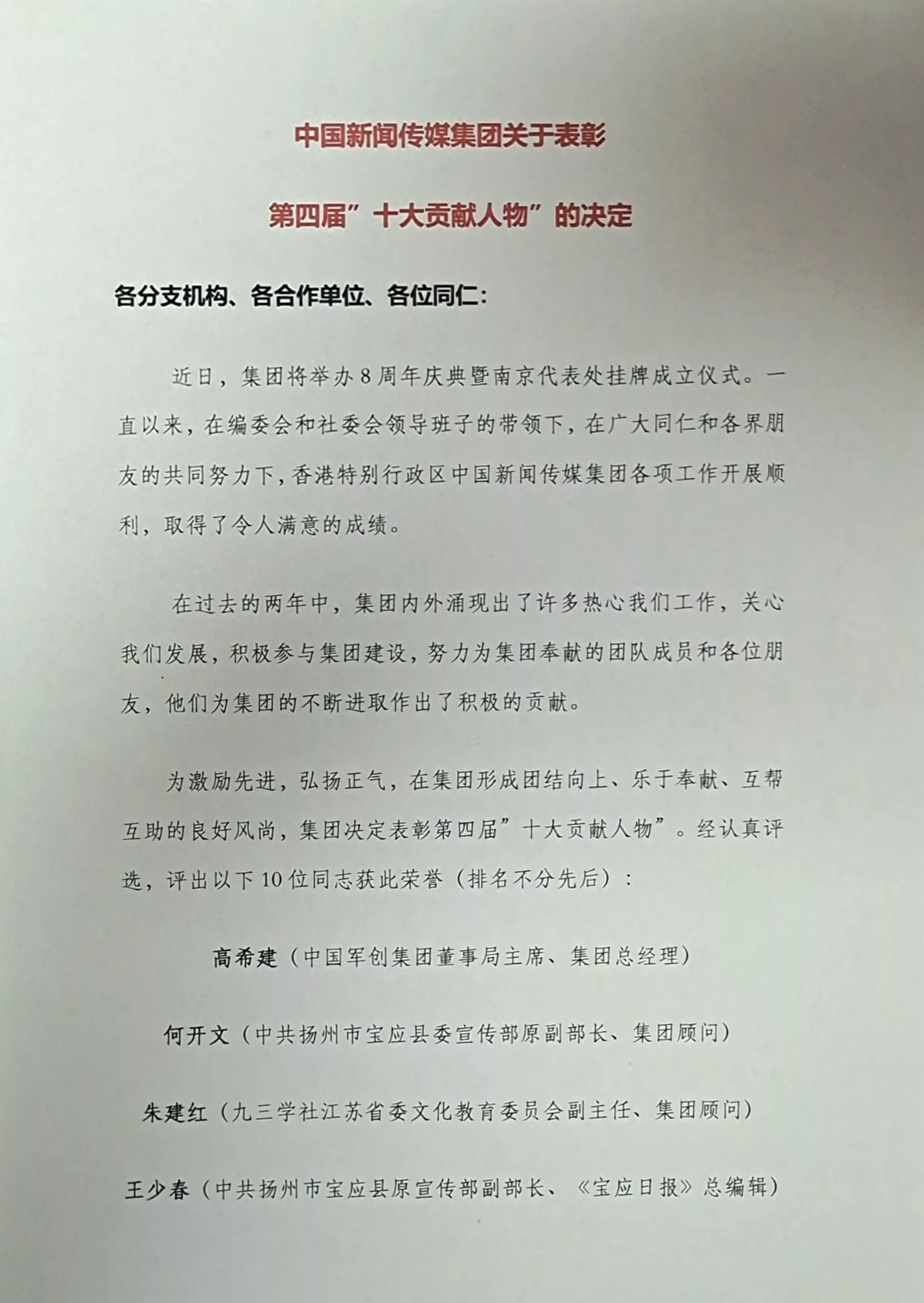 中国新闻传媒集团|关于表彰第四届”十大贡献人物”的决定
