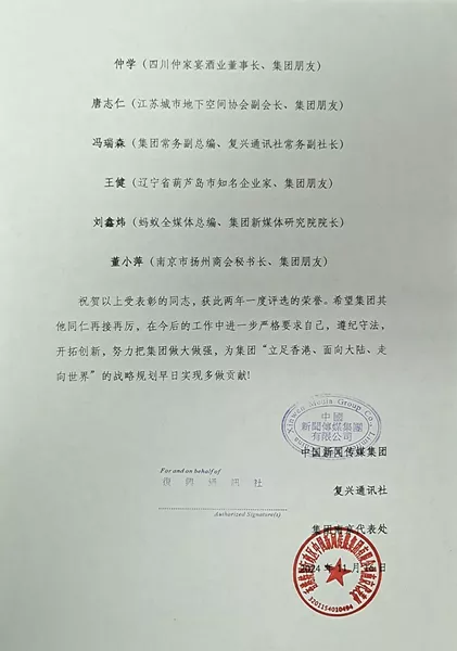 祝贺以上受表彰的同志,获此两年一度评选的荣誉。希望集团其他同仁再接再厉,在今后的工作中进一步严格要求自己,遵纪守法,开拓创新,努力把集团做大做强,为集团“立足香港、面向大陆、走向世界”的战略规划早日实现多做贡献!