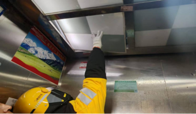 图为:新疆阿克苏地区温宿县温宿镇凤溪社区骑手之家志愿者在鼎隆华府小区送餐中发现高层电梯内隔板掉落易砸伤人员的安全隐患(孔繁梅摄)