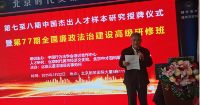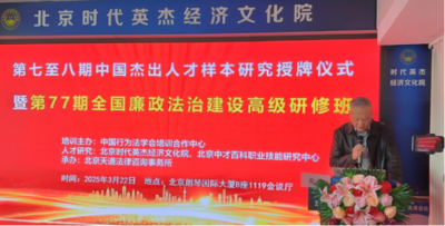 中国融媒北京3月23日电 中国杰出人才样本研究项目颁发纪念证书仪式暨第77期全国廉政法治研修班于2025年3月22日在京举行。廉政法治专家、中央纪委纪检监察研究所原副所长姬广勤,国家教育部督学、北京大学教授、北京时代英杰经济文化院首席顾问熊胜忠,廉政法治研究专家、中宣部出版物数据中心退休干部张铁林,中央民族大学学术委员会秘书长、中央民大法学院首任院长、二级教授宋才发,北京工业大学文法学院教授、中国未成年人保护十大杰出人物张荆,著名慈善家、中国首家青少年矫正基地发起人、中国未成年人保护十大杰出人物傅广荣,刑事诉讼法学博士,中国社科院法学所人权法学博士后,中国十大杰出刑事辩护大律师李扬,北京时代英杰经济文化院院长李笑天,北京时代英杰经济文化院执行秘书长姜涛,中国智慧工程研究会经济法治委员会法律智库专家、资深律师李志勇,中国智慧工程研究会经济法治委员会法律智库专家、普法讲师张丹丹等80余人出席活动。