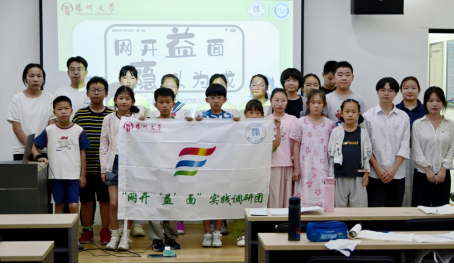 (图为7月15日,网开“益”面实践调研团成员在与竹西社区暑托班同学们共同合照。彭富培供图)