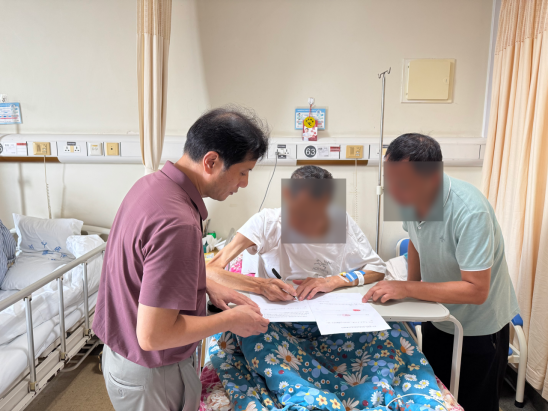 据悉,周老伯与张阿姨(化名)于2008年登记结婚,二人皆为再婚,婚后共同拥有一套位于无锡市扬名花园1号房2号门301室的房产。如今,周老伯身患重病,长期在无锡中医院接受治疗,身体虚弱的他最大的心愿,便是在离世前妥善安排房产继承事宜—— 他与张阿姨商量后,一致希望将这套夫妻共同房产留给张阿姨与前夫所生的继子小张(化名)。可这份“心意” 却让小张犯了难。考虑到家庭关系复杂,他担心接受房产后会引发新的矛盾,始终不愿明确表态。一边是病重老人急于了却的心愿,一边是继子顾虑重重的纠结,双方意见僵持不下,原本和睦的家庭氛围也变得紧张起来。无奈之下,张阿姨拨通了扬名司法所的求助电话。接到求助后,孙文杰所长深知此事关乎老人的心愿与家庭的和谐,更明白病重的周老伯无法亲自到司法所参与调解。彼时无锡正处于高温酷暑天气,室外温度接近38℃,但孙文杰所长没有丝毫犹豫,当即决定 “上门服务”,前往无锡中医院为双方调解。