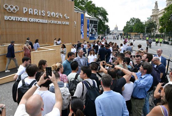 当地时间27日,位于香榭丽舍大道的巴黎奥运会官方特许商品旗舰店开门迎客。巴黎奥组委主席托尼·埃斯坦盖说,这家旗舰店是所有奥运会官方特许商店中“最大、最美的”。