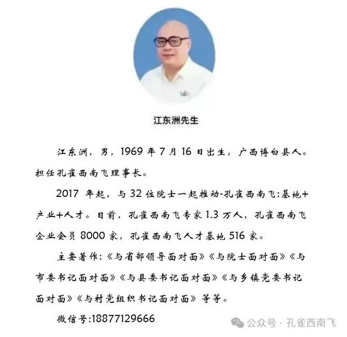 江东洲,男,1969年7月16日出生,广西博白县人。担任孔雀西南飞理事长。