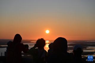 黑龙江省抚远市地处我国陆地最东端,有“华夏东极”之称。正值夏季旅游旺季,不少游客登上东极阁观赏日出。