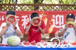 2024年8月5日,合肥庐阳区双岗街道白水坝社区,孩子们一起吃西瓜“啃秋”迎立秋,表达“啃下酷夏、迎接秋爽”的愿望。