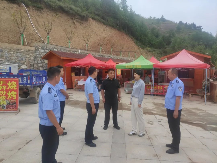为消除景区隐患问题,民警积极联合镇市场监管等部门人员,对景区内的农家乐、商铺、烧烤摊等主要场所和摊点开展清查和整治,主要对视频监控、消防设施、安全通道、经营资质、安保人员、煤油电气等方面进行了全方位的排查,对排查出的隐患问题,责令经营者现场整改或限期整改。清查期间,民警严格要求经营业主要落实“谁主管、谁负责”的安全防范机制,自觉加大自查自纠能力,倡导大家对在场所内及周边发现的各类违法犯罪线索,要及时制止并揭发举报,严防意外事件及案件的发生。