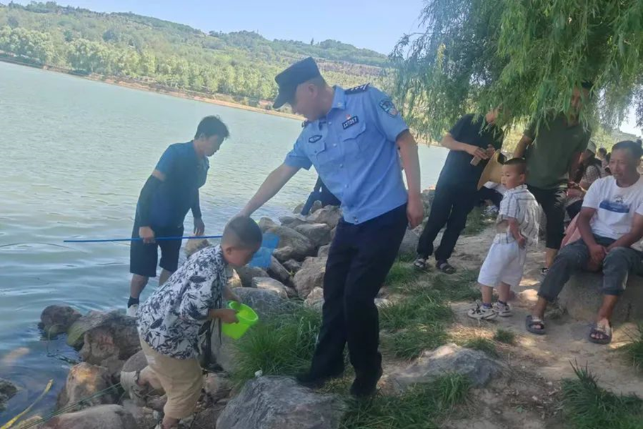 图:姜席派出所民警到晚霞湖景区劝导儿童远离水域