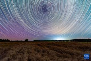 7月30日在黑龙江省富锦市上街基镇万有村拍摄的星空下的麦田(堆栈合成照片)。