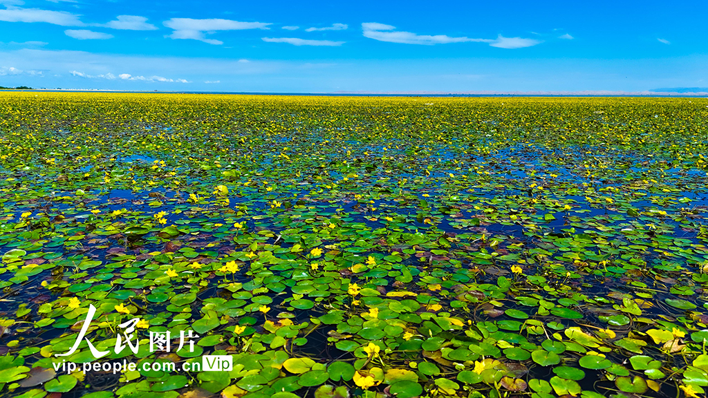 八月,新疆博斯腾湖千亩荇菜花开正盛,与蓝天、碧水、黄沙、芦苇相映,呈现出“一湖碧水半湖荇”的美丽画卷。年磊摄(人民图片网)