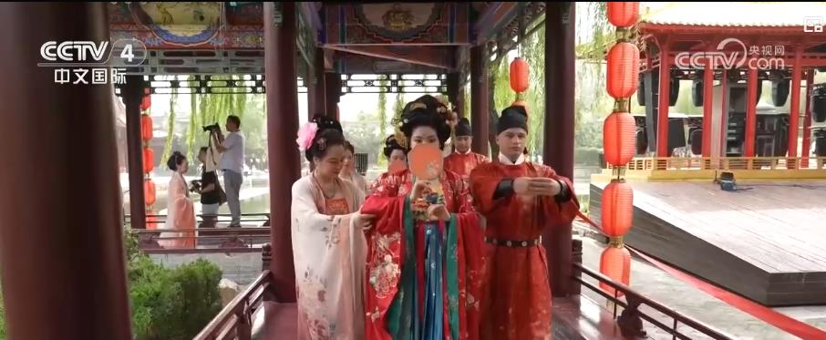 在陕西西安,来自丝路共建国家的外国友人及“一带一路”沿线建设者7对夫妻体验了一场古老的唐宫婚典。