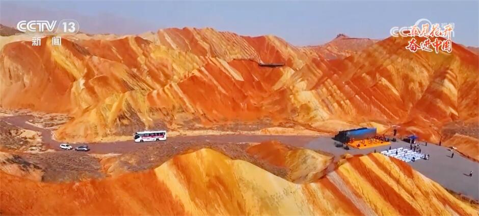 央视网消息:跟随镜头,我们来到了甘肃省张掖市的七彩丹霞景区,这里是我国北方干旱地区发育最典型的丹霞地貌,以色彩艳丽、层理交错、气势磅礴、场面壮观而著称。从空中鸟瞰,薄层状泥岩、砂质泥岩及页岩相互交错,紫红色、黄绿色等色彩交相辉映,组合有序,极富有韵律感和层次感。