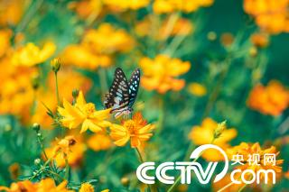 2024年8月30日,福建省福州市,黄秋英绽放,木兰青凤蝶闻香而来。