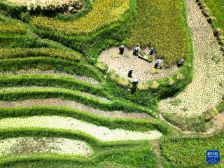 近日,位于月亮山区的贵州省从江、榕江等县梯田种植的水稻陆续迎来收获季节,当地农民抓住晴好天气收割、搬运、晾晒稻谷,确保秋粮及时归仓。