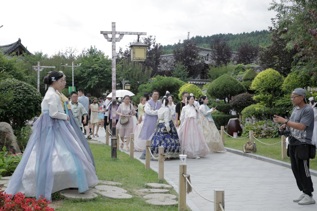 “暑假期间,每天平均客流量能达到2万多人次。”中国朝鲜族民俗园运营总监朱保坤说。他指着园区外的街道告诉记者:“这两年,我们这边涌现出数百家旅拍店,妆造和摄影风格不断升级,可以为游客们提供不同选择。”
