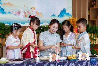 9月8日,在江苏省兴化市文林幼儿园,小朋友在老师的指导下学习做月饼。