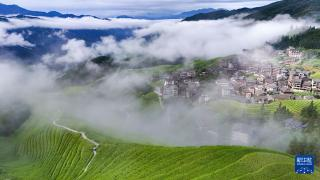 一场秋雨过后,广西龙胜各族自治县龙脊梯田云雾缭绕,云海、梯田、吊脚楼构成一幅幅美丽的田园画卷。