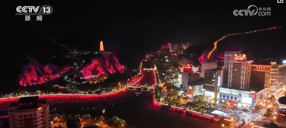 随着夜幕降临,宝塔山化身为一幅巨大的画布,上演着音乐灯光秀。声光合一、三山联动,360度环绕演绎,生动展现了延安的红色故事和文化特色。