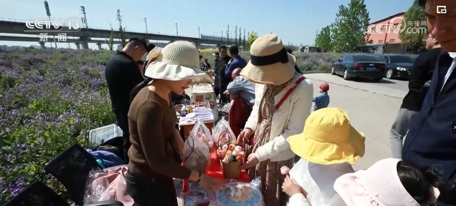 一年前,这里还是一片工地遗留的建筑渣土。当地与科研团队合作,引进营养土技术,一年内就将撂荒地变成了“桃花源”。花海边还摆起了创意市集,结合“花”元素的花饽饽、非遗农民画和黑陶工艺品,吸引了不少游客消费。