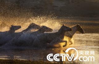 内蒙古赤峰:乌兰布统水上奔马浪花飞溅
