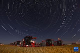 9月18日在北大荒集团黑龙江七星农场有限公司拍摄的星空下的稻田中的收割机(堆栈合成照片)。