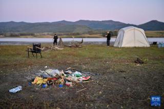 在吉林省吉林市松花湖岸边,露营爱好者在搭建帐篷,垃圾散落在附近(10月2日摄)。