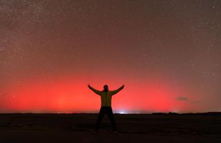 10月11日凌晨,摄影爱好者在黑龙江省富锦市松花江畔拍摄极光。