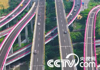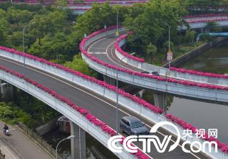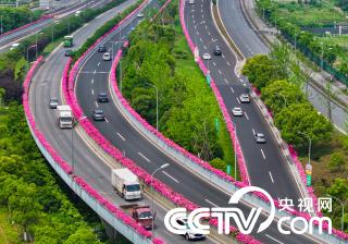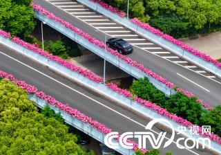 2024年5月8日,浙江宁波,高架上的月季相继绽放,把车道装点成一条条美丽的“空中花廊”。